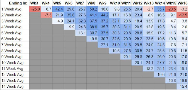 Here's how that prediction played out over the course of the season, comparing Group B's rushing total to Group A's over each 1-week, 2-week, 3-week, 4-week, and on through 14-week spans. I've applied a heat map; BLUE means that Group B averaged more yards per game, RED means Group A averaged more yards per game. (Grey means the comparison isn't available; we can't find a 6-week average after only three weeks, right?)