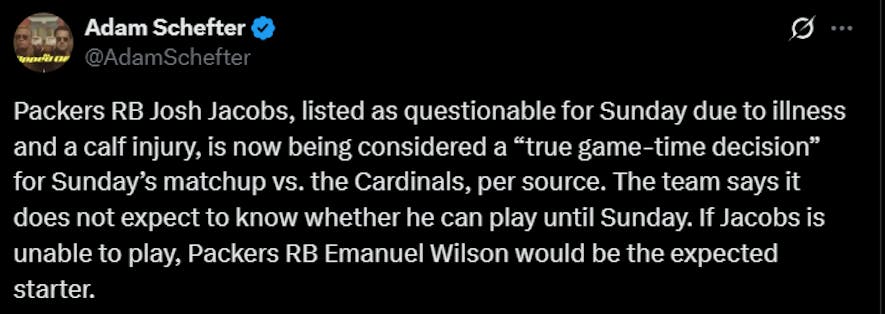 The problem is that this is a 4:30PM EST game, and the only player that I have in my 4PM slate window is Jacory Croskey-Merritt. If Jacobs does not play, Emanuel Wilson becomes an excellent value play at $4,400. If I had to guess, I would put it at 60% that he does not play, which is why this matters. It can create a unique late swap scenario if done right.